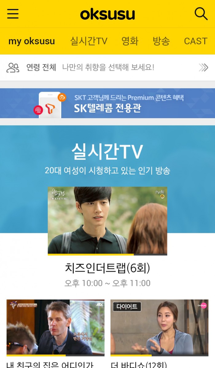 프리미엄 고객 전용 앱인 ‘T 프리미엄 플러스’를 사용하고 있는 고객도 VOD(주문형비디오)플러스 메뉴를 통해 접속하면 전용관 서비스를 즐길 수 있다.모바일 동영상 플랫폼 옥수수 화면.<사진제공=SK텔레콤>