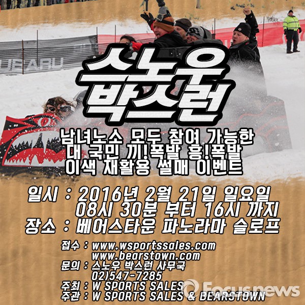 이랜드 관계자는 “해외에서는 이미 이색적인 겨울 놀이문화로 자리 잡고 있는 박스 레이스가 국내 최초로 스키리조트 베어스 타운에서 열리게 됐다”라며 “스노우박스런은 창의력과 도전정신을 뽐내며 모두가 즐길 수 있는 겨울 이색 놀이 문화로 자리 매김 할 것으로 기대한다”라고 말했다.이랜드 스키리조트 베어스타운에서는 2월21일 이색 썰매 경기인 스노우박스런 대회를 개최한다.<사진제공=이랜드>