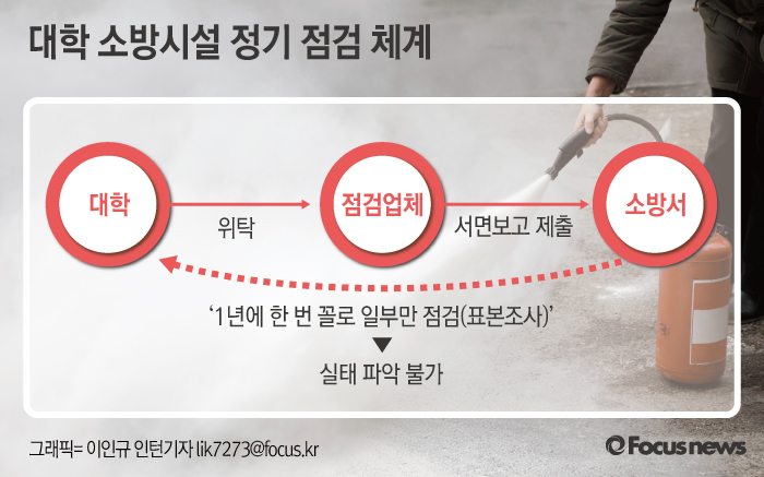 제교수는 대학을 포함한 특정소방대상물은 정기점검을 1년에 두 번 실시하는데 이 방식에도 문제가 있다고 지적했다. 정기점검은 종합 정밀 점검, 작동 기능 점검 두 종류인데 현재는 건물 관계인이 직접 업체를 선정해 위탁하고 소방서는 결과를 서면으로 보고받는다. 이런 방식으로는 업체가 건물주 눈치를 보고 지적 사항이 있어도 보고서에서 누락시킬 가능성이 있다. 그는 “‘을’ 처지에 있는 점검하는 관리사는 ‘갑’인 건물주의 말을 들을 수밖에 없다”며 “중대한 지적 사항이 보고서에서 누락될 수도 있다”고 덧붙였다.