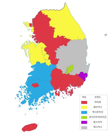 지역별로는 비비큐가 서울과 부산, 광주, 경기, 충북, 경남, 제주 등 7개 지역에서 가장 많은 가맹점을 보유했다. 페리카나는 인천과 대전, 세종, 강원, 충남 등 5개 지역에서, '맥시칸치킨'은 전북과 전남 등 2개 지역에서 가맹점수가 가장 많았다,