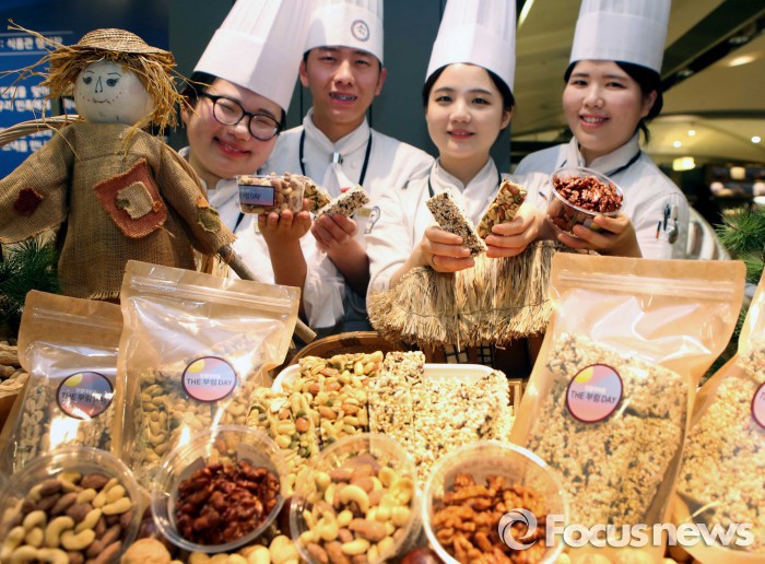 이번 행사에서는 우송대학교 글로벌 한식조리학과 학생들이 직접 만든 오곡바와 호두강정, 허니버터 아몬드 등을 판매한다. 특히 오곡바는 정월대보름의 전통음식인 오곡밥을 현대식으로 재해석 했다.21일 현대백화점 압구정본점에서 학생들과 모델들이 ‘더 부럼 데이’ 행사 판매 상품을 선보이고 있다.<사진제공=현대백화점>