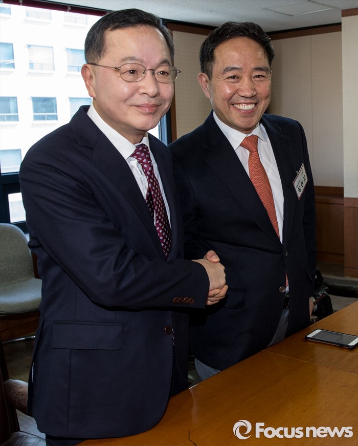 (서울=포커스뉴스) 서울 마포갑 지역에 새누리당 공천 신청서를 제출한 안대희 최고위원과 강승규 전 의원이 21일 나란히 공천을 위한 면접에 참석했다. 두 예비후보의 '어색한' 만남은 성사만으로도 크게 눈길을 끌었다.