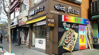 해지온은 다음달부터 가맹사업을 본격 전개해 올해말까지 50개점포 개설을 목표로 하고 있다.서울 당산에 개장한 '케이콜라보 김밥' 1호점 전경.<사진제공=해지온>