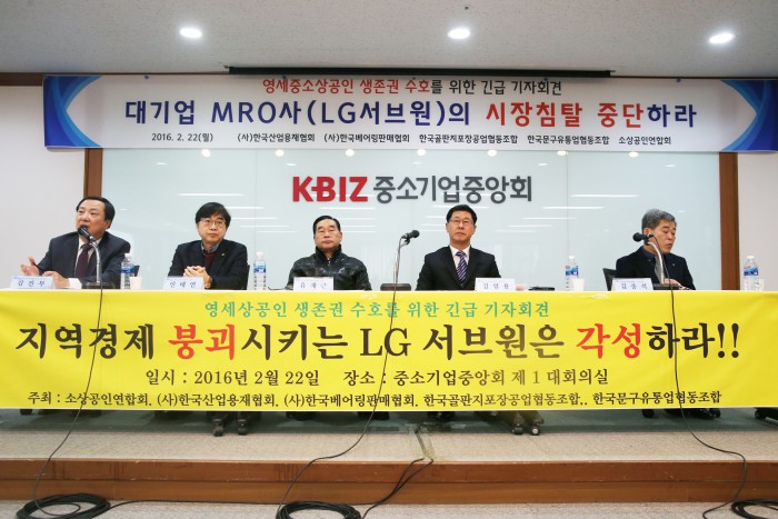 앞서 MRO 중소상공인단체인 한국골판지포장공업협동조합과 한국문구유통업협동조합, 한국베어링판매협회 등은 이날 오전 서울 여의도 중소기업중앙회에서 '대기업 MRO사(LG 서브원)의 시장침탈 중단'을 촉구하는 기자회견을 가졌다.