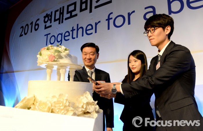 한편 서울 역삼동에서 열린 입사식은 정명철 사장을 비롯한 각 본부 임원들이 참석한 가운데 319명 신입사원에 대한 사령장 수여, 격려사, 탐구생활 발표 순으로 진행됐다.정명철 현대모비스 사장(왼쪽)과 남녀 신입사원 대표가 ‘현대모비스 2016 상반기 신입사원 입사식’에서 케이크를 자르고 있다. <사진제공=현대모비스>