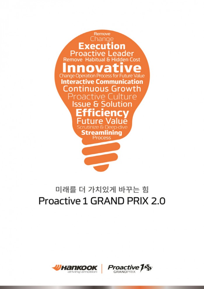 서승화 한국타이어 대표이사(부회장)은 “구성원들에게 내재되어 있는 혁신DNA를 ‘프로액티브 원 그랑프리’를 통해 더욱 강화시켜 글로벌 톱 타이어 도약에 박차를 가할 것”이라고 말했다.‘프로액티브 원 그랑프리 2.0(Proactive 1 GRAND PRIX 2.0)’홍보 이미지. <사진제공=한국타이어>