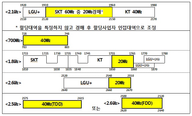 또 다른 관계자는 "이번 주파수 경매에서 2.1㎓ 재할당 대가가 과도하게 연계될 경우, SK텔레콤과 KT는 입찰 가격이 올라갈수록 재할당 대가도 동시에 비싸지게 돼 사실상 경매에 제한을 받게 된다"며 "결국 LG유플러스가 저가에 2.1㎓를 할당 받을 수 있는 가능성이 높고 이렇게 아낀 경매 비용을 2.6㎓에도 사용할 수 있어 전체 대역 독점도 가능하다"고 주장했다.오는 4월 분배 예정인 주파수. 맨 위 노란색 부분이 경매에 부쳐지는 2.1기가헤르츠(㎓) 대역 20메가헤르츠(㎒)폭이다. <사진제공=미래부>