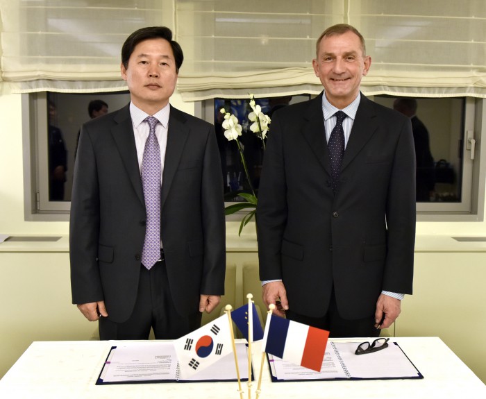 김기덕 우본 본부장은 "유럽 주요 시장에 대한 물류비용 부담을 물류비용을 최대한 낮출 수 있는 새로운 전자상거래 전용 배송서비스를 선보이게 됐다"면서 "신규 특송서비스가 유럽행 전자상거래 상품 수출 활성화에 기여할 것으로 기대된다"고 말했다.김기덕 우본 본부장(왼쪽)과 폴 마리 샤반느 프랑스 우정 사장이 23일(한국시간) 파리에서 '한-유럽 우체국특송서비스' 협정을 체결하고 있다.<사진제공=우정사업본부>