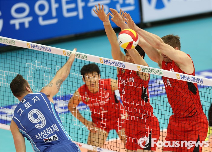 (수원=포커스뉴스) 23일 수원실내체육관에서 열린 '2015-2016NH농협 V-리그' 남자부 한국전력-삼성화재 경기에서 삼한국전력 방신봉과 얀 스토크가 삼성화재 그로저의 스파이크를 블로킹으로 막고 있다.