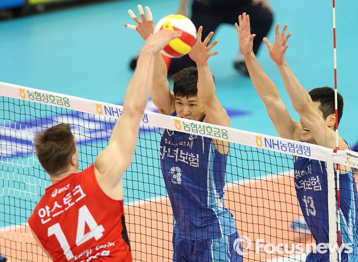 (수원=포커스뉴스) 23일 수원실내체육관에서 열린 '2015-2016NH농협 V-리그' 남자부 한국전력-삼성화재 경기에서 삼성화재 최귀엽과 이선규가 한국전력 얀 스토크의 스파이크에 블로킹을 대고 있다.