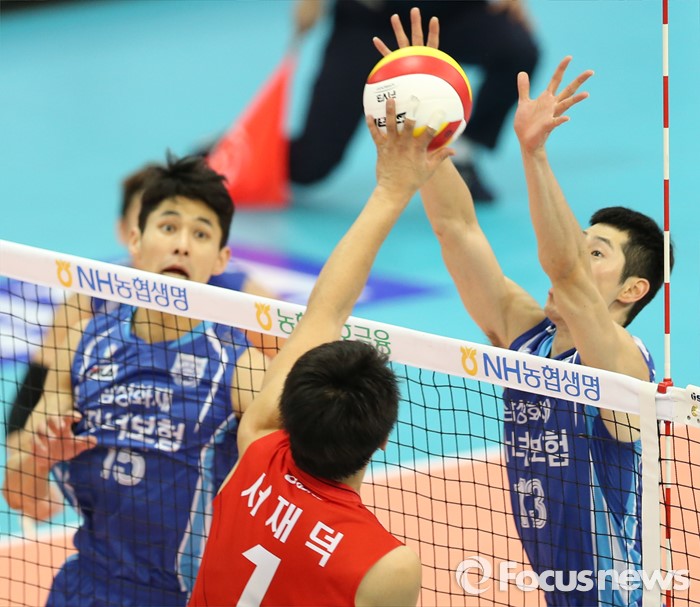 (수원=포커스뉴스) 23일 수원실내체육관에서 열린 '2015-2016NH농협 V-리그' 남자부 한국전력-삼성화재 경기에서 삼성화재 최귀엽이 한국전력 서재덕의 스파이크에 블로킹을 대고 있다.