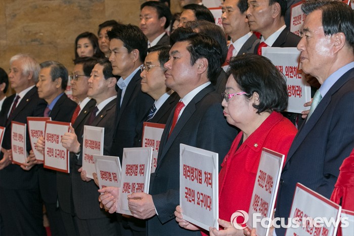 (서울=포커스뉴스) 새누리당 의원들이 23일 오후 서울 여의도 국회 로텐더홀에서 테러방지법과 관련한 야당의 필리버스터에 대해, 규탄성명을 발표하고 있다.