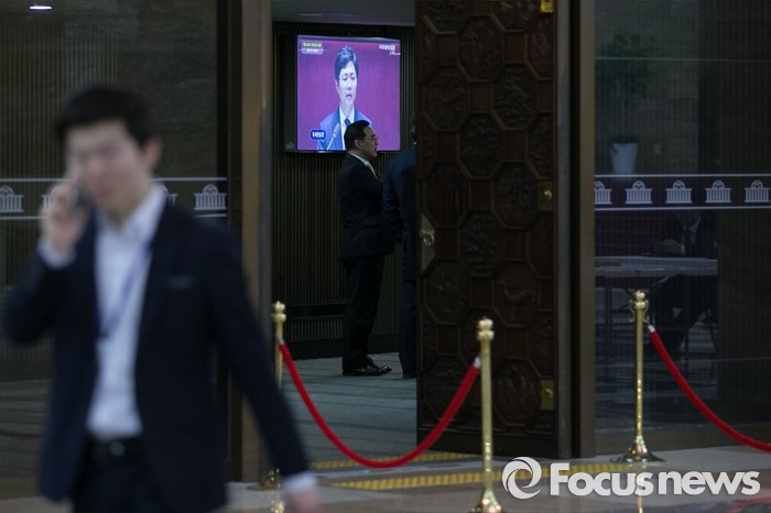(서울=포커스뉴스) 23일 오후 서울 여의도 국회 본회의장 정문 앞 모니터에 테러방지법과 관련한 김광진 더민주 의원의 무제한 반대토론이 중계되고 있다.