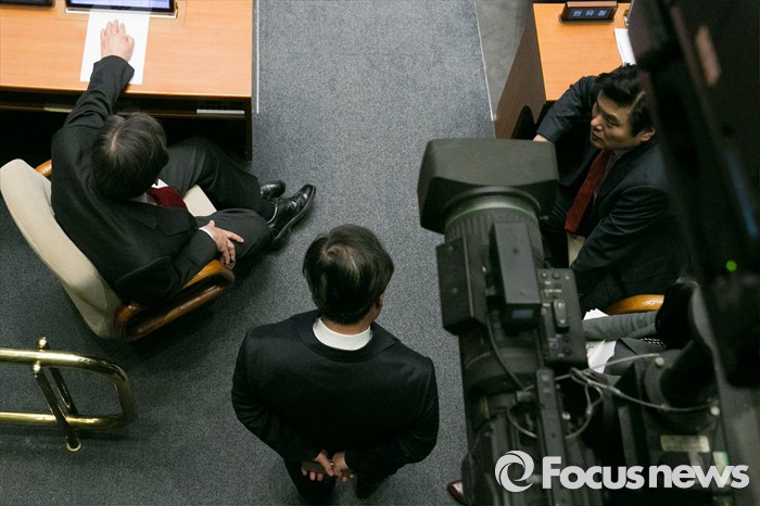(서울=포커스뉴스) 김무성(왼쪽) 새누리당 대표와 원유철(오른쪽) 원내대표가 23일 오후 서울 여의도 국회 본회의장에서 테러방지법과 관련해 김광진 더민주 의원이 무제한 토론을 하는 동안 논의하고 있다.