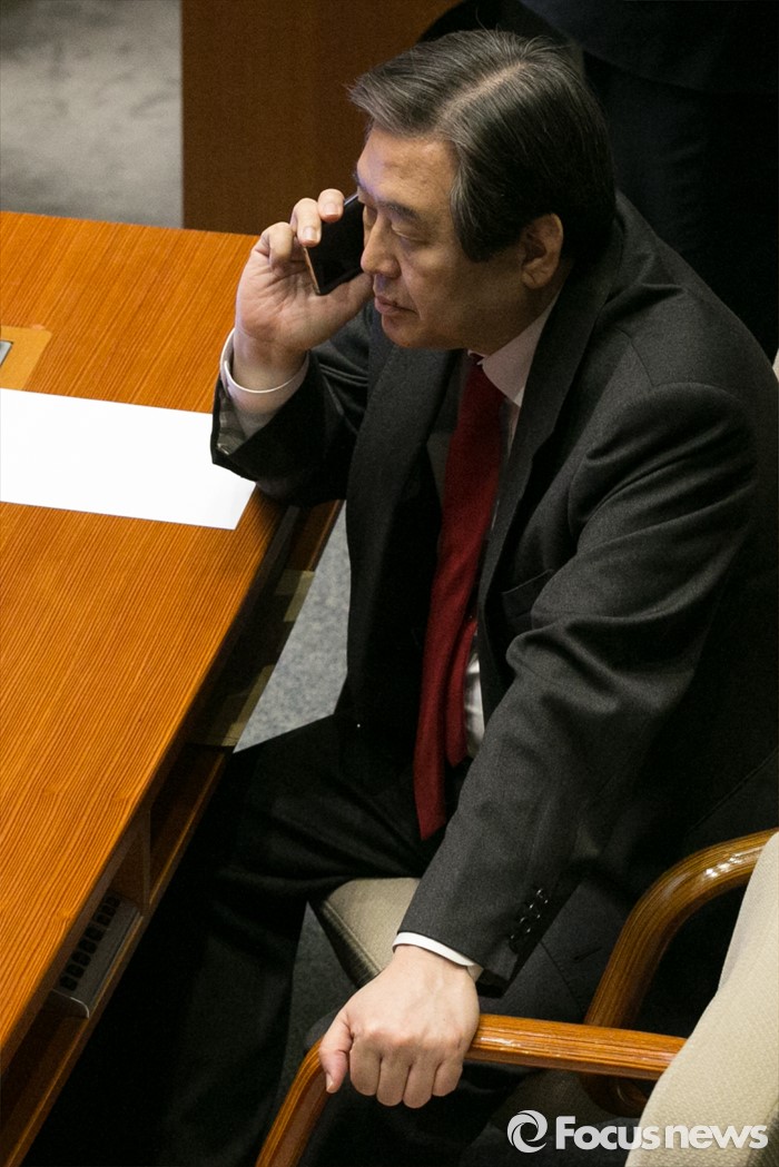 (서울=포커스뉴스) 김무성 새누리당 대표가 23일 오후 서울 여의도 국회 본회의장에서 테러방지법과 관련해 김광진 더민주 의원이 무제한 토론을 하는 동안, 전화통화하고 있다.