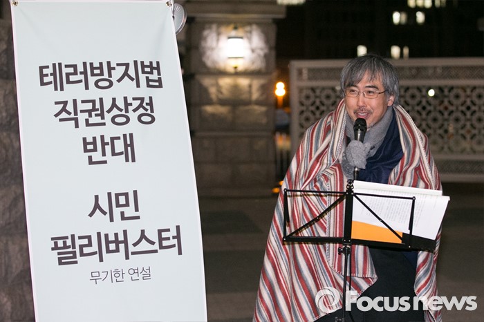 (서울=포커스뉴스) 이태호 참여연대 사무처장이 24일 오전 서울 여의도 국회 정문 앞에서 테러방지법 처리를 반대하는 시민 필리버스터를 진행하고 있다.
