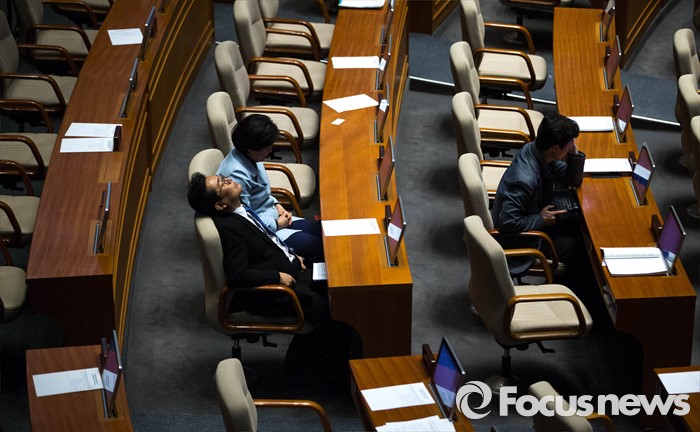 (서울=포커스뉴스) 23일 오후 서울 여의도 국회에서 테러방지법 직권상정을 막기 위해 야당의 릴레이 '필리버스터' 가 시작된 가운데 지친 의원들이 휴식을 취하고 있다.
