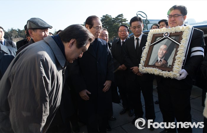 (서울=포커스뉴스) 24일 오전 서울 여의도 국회의사당 본청 앞에서 김무성 새누리당 대표가 故 이기택 전 민주당 총재의 4.19 민주사회장 영결식에 참석해 인사를 하고 있다.