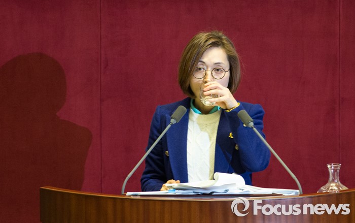 (서울=포커스뉴스) 더불어민주당 김광진 의원의 5시간32분을 깨고, 7시간째 필리버스터를 이어가고 있는 두 번째 필리버스터 주자 은수미 더불어민주당 의원이 24일 오전 서울 여의도 국회 본회의장에서 테러방지법과 관련해 무제한 토론을 하던 중 물을 마시고 있다.