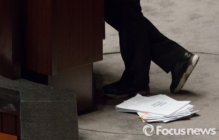 (서울=포커스뉴스) 24일 오전 서울 여의도 국회에서 은수미 더불어민주당 의원이 테러방지법과 관련해 무제한 토론을 이어가고 있다. 은 의원이 읽었던 원고가 발 아래 쌓여있다.