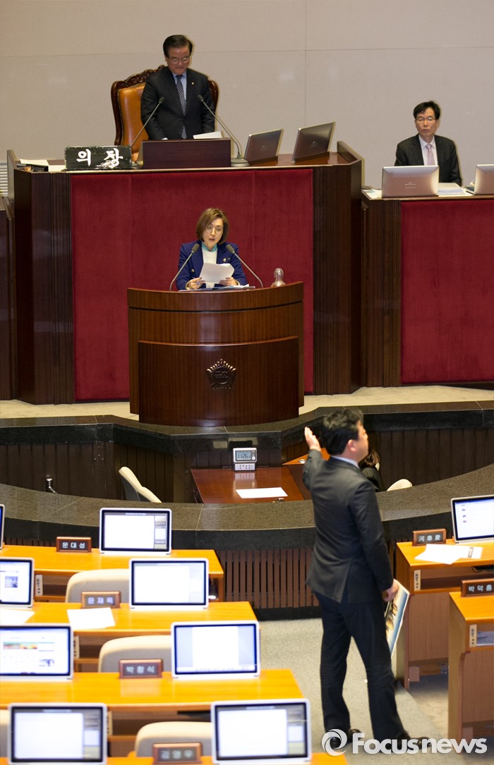(서울=포커스뉴스) 테러방지법 직권상정에 반발해 야당의 무제한 토론(필리버스터)이 진행되고 있는 24일 오전 서울 여의도 국회 본회의장에서 김용남 새누리당 의원이 토론 진행 중인 은수미 더불어민주당 의원을 향해 항의하고 있다.