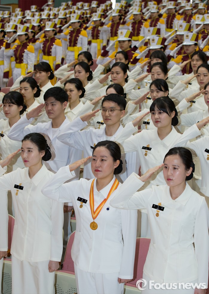 (대전=포커스뉴스) 24일 오전 대전 유성구 국군간호사관학교 백합관에서 열린 졸업매달 수여식에서 졸업식을 앞둔 제56기 생도들이 거수경례를 하고 있다.