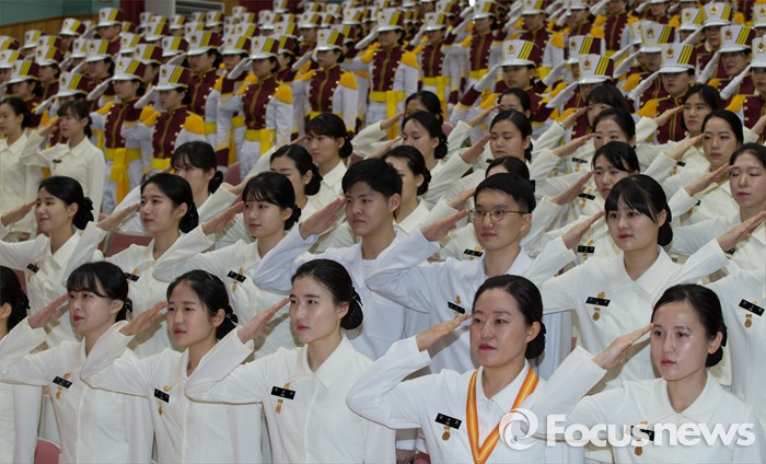 (대전=포커스뉴스) 24일 오전 대전 유성구 국군간호사관학교 백합관에서 열린 졸업매달 수여식에서 졸업식을 앞둔 제56기 생도들이 거수경례를 하고 있다.