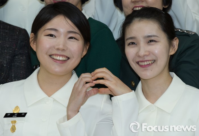 (대전=포커스뉴스) 24일 오전 대전 유성구 국군간호사관학교 백합관에서 열린 졸업매달 수여식에서 졸업식을 앞둔 제56기 생도들이 하트를 만들어 보이며 기념촬영을 하고 있다.