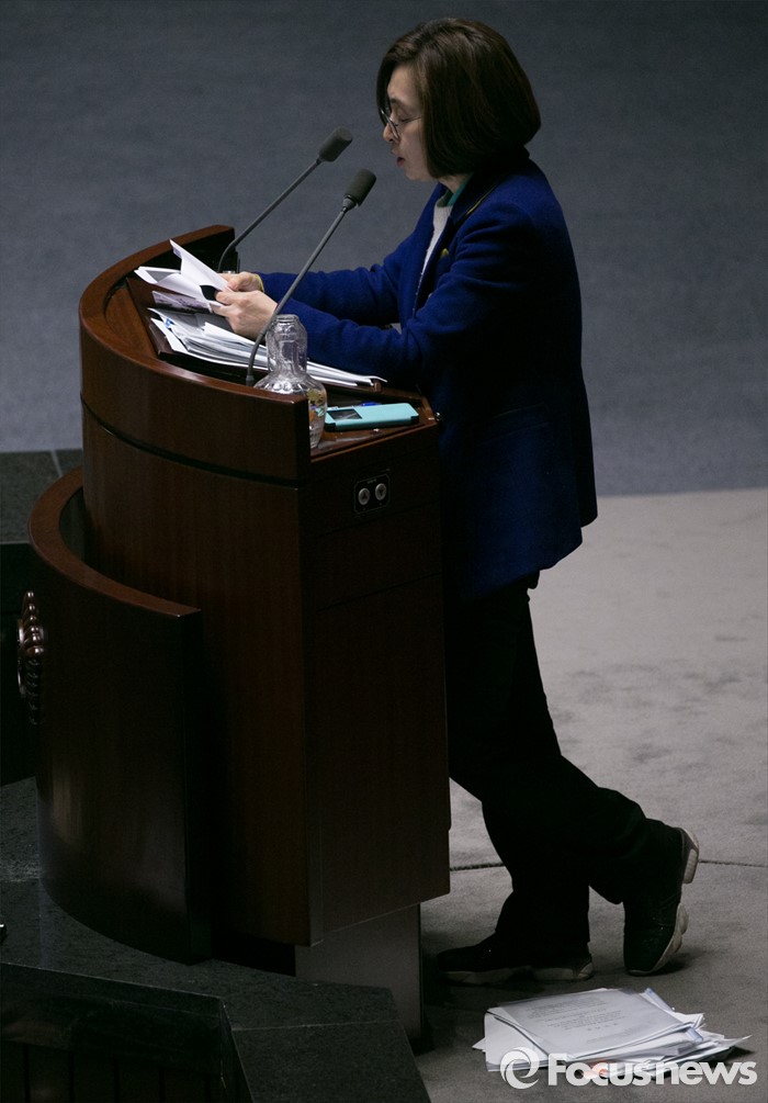 (서울=포커스뉴스) 테러방지법 직권상정에 반발해 야당의 무제한 토론(필리버스터)이 진행되고 있는 24일 오후 서울 여의도 국회 본회의장에서 토론에 참여한 은수미 더불어민주당 의원이 발언하고 있다. 은 의원은 이날 10시간 18분의 토론을 기록해 국내 최장기록인 10시간 15분을 경신했다.