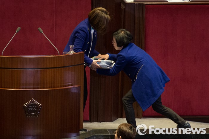 (서울=포커스뉴스) 테러방지법 직권상정에 반발해 야당의 무제한 토론(필리버스터)이 진행되고 있는 24일 오후 서울 여의도 국회 본회의장에서 토론에 참여한 은수미 더불어민주당 의원이 발언을 끝내고 퇴장하고 있다. 은 의원은 이날 10시간 18분의 토론을 기록해 국내 최장기록인 10시간 15분을 경신했다.