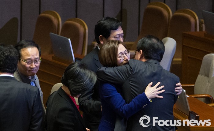 (서울=포커스뉴스) 테러방지법 직권상정에 반발해 야당의 무제한 토론(필리버스터)이 진행되고 있는 24일 오후 서울 여의도 국회 본회의장에서 토론을 마친 은수미 더불어민주당 의원이 동료 의원들의 격려를 받고 있다. 은 의원은 이날 10시간 18분의 토론을 기록해 국내 최장기록인 10시간 15분을 경신했다.