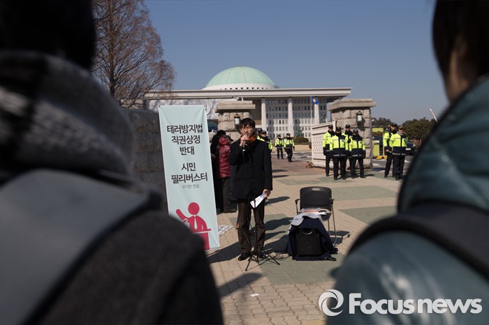 (서울=포커스뉴스) 24일 오후 서울 여의도 국회 정문 앞에서 테러방지법 처리를 반대하는 시민이 필리버스터에 참여해 연설을 하고 있다.