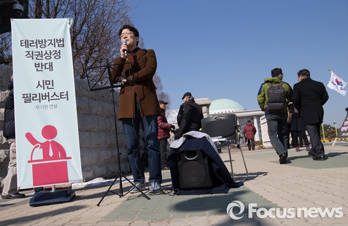 (서울=포커스뉴스) 24일 오후 서울 여의도 국회 정문 앞에서 테러방지법 처리를 반대하는 시민이 필리버스터에 참여해 연설을 하는 가운데 주위로 시민들이 지나가고 있다.