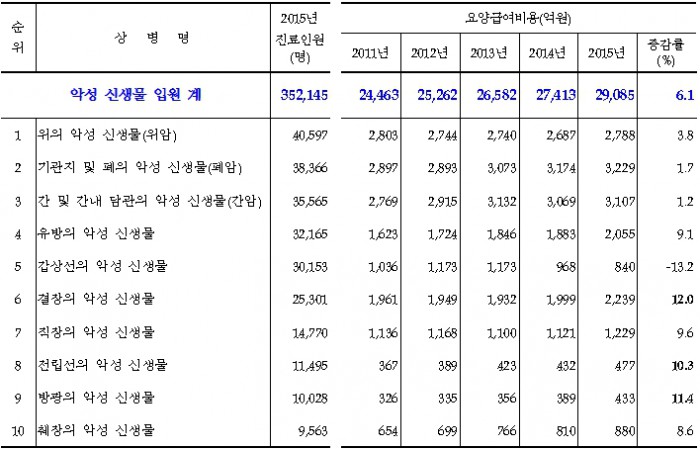 특히 암으로 입원 진료한 인원은 35만2145명으로, 진료비는 2조9085억원이 발생했다. 이는 전년 대비 6.1% 증가한 수치다.