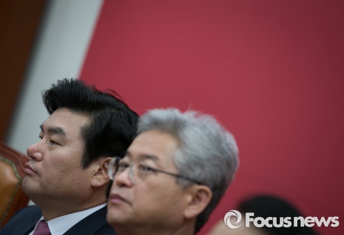 (서울=포커스뉴스) 테러방지법 직권상정에 반발해 야당의 무제한 토론(필리버스터)이 진행되고 있는 24일 오후 서울 여의도 국회에서 열린 새누리당 원내대표단-정보위원회 연석회의에 참석한 원유철(왼쪽) 원내대표와 이철우 정보위 여당 간사가 생각에 잠겨 있다.