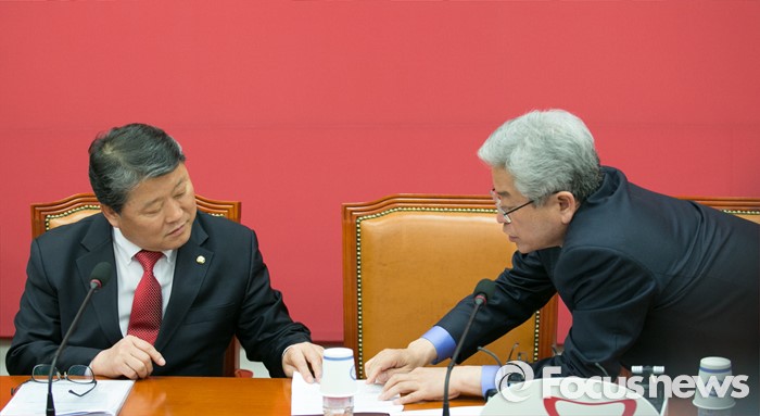(서울=포커스뉴스) 테러방지법 직권상정에 반발해 야당의 무제한 토론(필리버스터)이 진행되고 있는 24일 오후 서울 여의도 국회에서 열린 새누리당 원내대표단-정보위원회 연석회의에 참석한 조원진(왼쪽) 원내수석부대표와 이철우 정보위 여당 간사가 대화하고 있다.