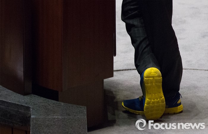 (서울=포커스뉴스) 테러방지법 직권상정에 반발해 야당의 무제한 토론(필리버스터)이 진행되고 있는 24일 오후 서울 여의도 국회 본회의장에서 박원석 정의당 의원이 발언하고 있다. 사진은 박 의원이 착용한 운동화.