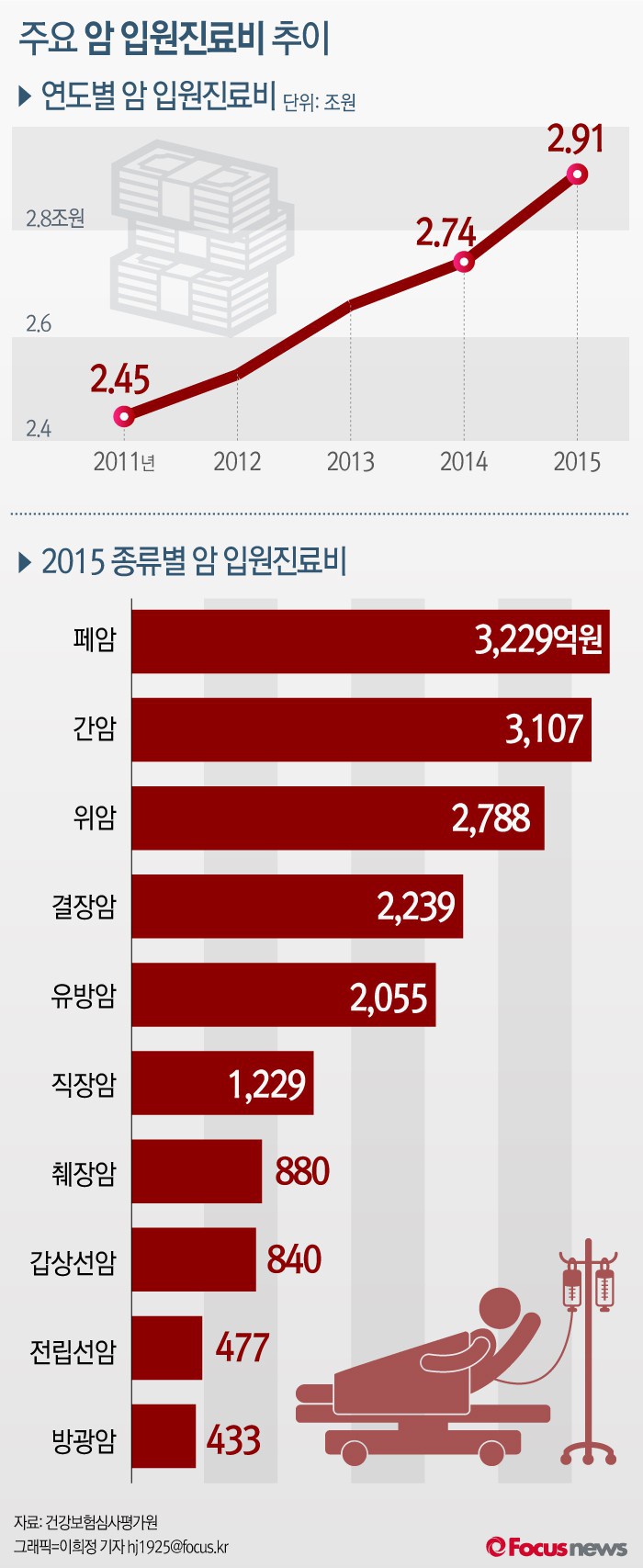 (서울=포커스뉴스) 24일 건강보험심사평가원이 발표한 ‘2015년 진료비 심사실적 통계’에 따르면 암으로 입원 진료한 인원은 35만2145명으로, 진료비는 2조9085억원이 발생했다. 입원진료비가 가장 높은 암은 폐암으로 진료비는 전년 대비 1.7% 증가한 3229억원 수준이었으며, 간암이 3107억원으로 그 뒤를 이었다.