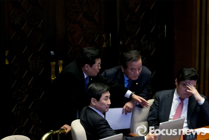 (서울=포커스뉴스) 테러방지법 직권상정에 반발해 야당의 무제한 토론(필리버스터)이 진행되고 있는 24일 오후 서울 여의도 국회 본회의장에서 원유철(오른쪽부터) 새누리당 원내대표, 정갑윤 국회 부의장, 전병헌 더불어민주당 의원, 이종걸 원내대표가 대화하고 있다.
