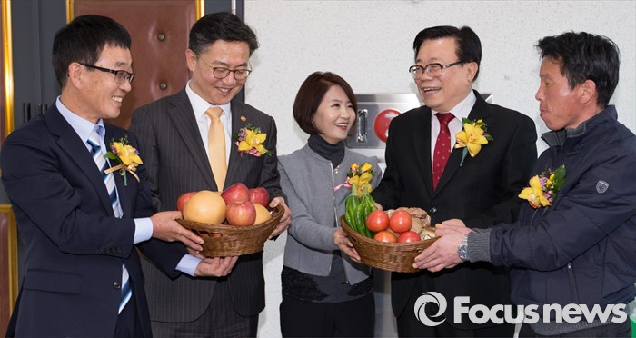 (안성=포커스뉴스) 24일 오후 경기 안성시 하나원에서 열린 하나원 농업·농촌 홍보관 개관식에서 이동필 농림축산식품부 장관과 홍용표 통일부 장관이 농촌 정착이탈주민들과 대화하고 있다.