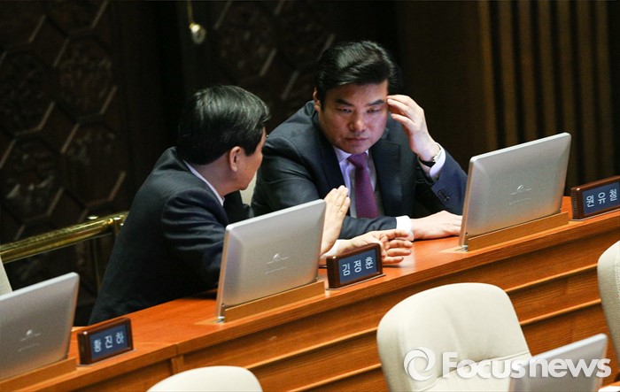 (서울=포커스뉴스) 박원석 정의당 의원이 24일 오후 서울 여의도 국회 본회의장에서 테러방지법의 본회의 의결을 막기 위한 필리버스터(무제한 토론을 통한 합법적 의사진행 방해)를 하고 있는 가운데 원유철(오른쪽) 새누리당 원내대표와 이종걸 더불어민주당 원내대표가 대화를 나누고 있다.
