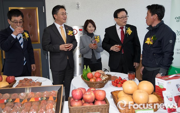 (안성=포커스뉴스) 24일 오후 경기 안성시 하나원에서 열린 하나원 농업·농촌 홍보관 개관식에서 이동필 농림축산식품부 장관과 홍용표 통일부 장관이 농촌 정착 북한 이탈주민들과 대화를 나누고 있다.