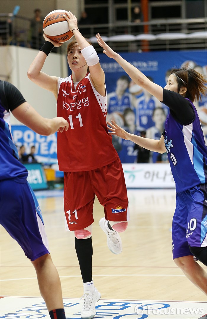 (구리=포커스뉴스) 24일 구리시체육관에서 열린 2015~2016 여자프로농구 KDB생명-삼성생명 경기에서 KDB생명 조은주가 삼성생명 고아라의 수비를 제치고 슈팅을 하고 있다.