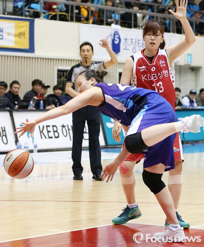 (구리=포커스뉴스) 24일 구리시체육관에서 열린 2015~2016 여자프로농구 KDB생명-삼성생명 경기에서 삼성생명 배혜윤이 드리블하다 KDB생명 김소담의 파울에 넘어지고 있다.