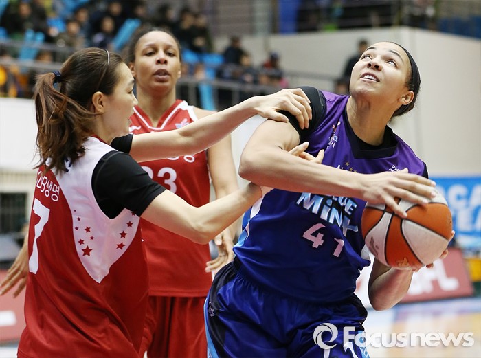 (구리=포커스뉴스) 24일 구리시체육관에서 열린 2015~2016 여자프로농구 KDB생명-삼성생명 경기에서 KDB생명 한채진이 슈팅을 노리는 삼성생명 스톡스의 팔을 잡고 있다.