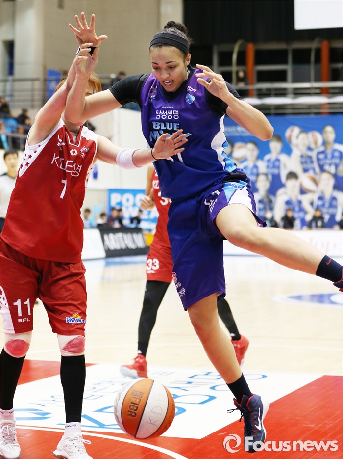 (구리=포커스뉴스) 24일 구리시체육관에서 열린 2015~2016 여자프로농구 KDB생명-삼성생명 경기에서 삼성생명 스톡스와 KDB생명 전보물이 리바운드를 다투다 볼을 놓치고 있다.