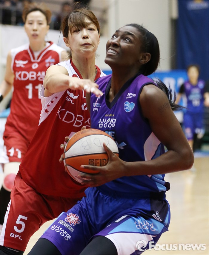 (구리=포커스뉴스) 24일 구리시체육관에서 열린 2015~2016 여자프로농구 KDB생명-삼성생명 경기에서 KDB생명 이경은이 골밑슛을 노리는 삼성생명 테일러를 마크하고 있다.