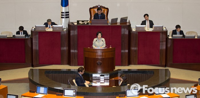 (서울=포커스뉴스) 테러방지법 직권상정에 반발해 야당의 무제한 토론(필리버스터)이 진행되고 있는 24일 오후 서울 여의도 국회 본회의장에서 유승희 더불어민주당 의원이 발언하고 있다.