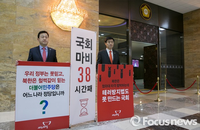 (서울=포커스뉴스) 테러방지법 직권상정에 반발해 야당의 무제한 토론(필리버스터)이 사흘째 진행되고 있는 25일 오전 서울 여의도 국회 본회의장 앞에서 김용남(왼쪽), 심윤조 새누리당 의원이 무제한 토론을 비판하는 시위를 하고 있다.