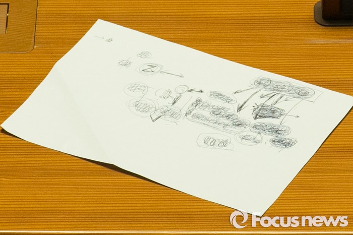(서울=포커스뉴스) 테러방지법 저지를 위한 야당의 무제한 토론(필리버스터)이 진행중인 25일오전 서울 여의도 국회 본회의장에서 한 여당 의원석에 낙서한 종이가 놓여 있다.